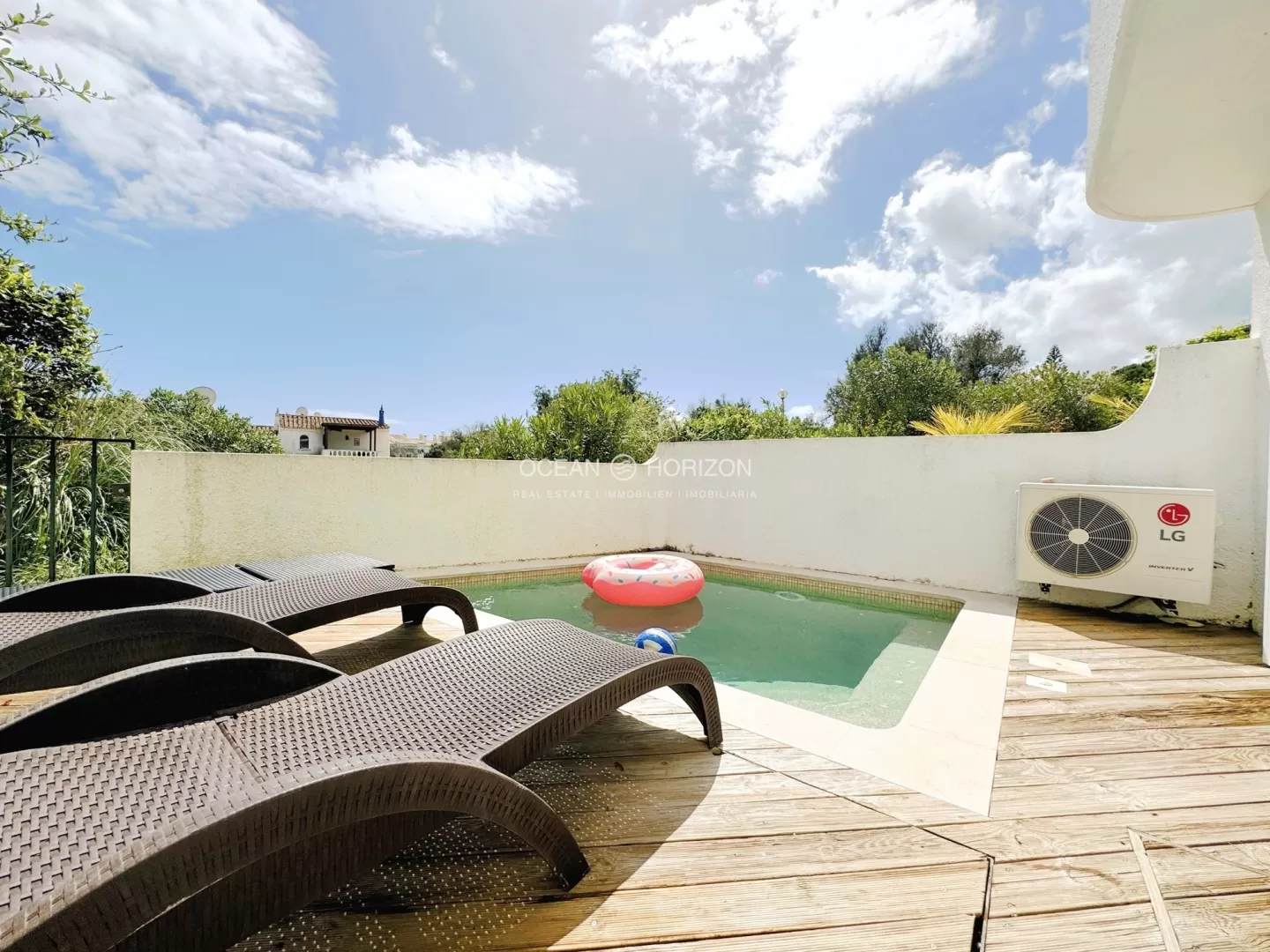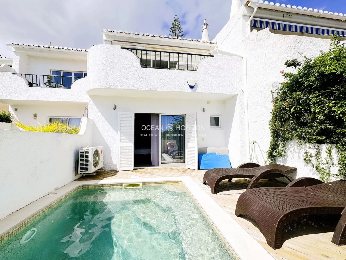 Bem-vindo a esta encantadora casa geminada com vista para o mar e uma pequena piscina na pitoresca cidade costeira da Praia da Luz, no Algarve. Situada numa tranquila rua sem saída, a casa não fica longe do centro e da praia, ambos a uma curta distância a pé. O bonito passeio marítimo da vila, os pequenos supermercados, farmácias, médicos e vários restaurantes e cafés também são de fácil acesso. Uma pequena escadaria conduz à porta da frente, que dá acesso à luminosa área de estar/jantar em plano aberto e à cozinha totalmente equipada. Existe uma varanda em frente à sala de estar, que oferece espaço suficiente para uma mesa, cadeiras e outros móveis. Pode desfrutar da vista para o mar não só a partir daqui, mas de todo o piso. Uma escada leva-o ao piso inferior. Aqui encontrará uma casa de banho com um chuveiro e dois quartos muito espaçosos com roupeiros embutidos. Um dos quartos tem uma casa de banho privativa com uma janela. Um dos quartos tem acesso a um pequeno pátio/terraço, o outro quarto tem acesso ao jardim e à piscina. Construída em 1987, esta propriedade foi completamente renovada e modernizada há cerca de 5 anos. Foi equipada com radiadores electricos, ar condicionado e dois painéis solares. Esta propriedade não é apenas adequada como residência permanente, mas também como casa de férias e oportunidade de investimento, uma vez que pode ser pedida uma licença. Saiba mais detalhes ou marque uma visita diretamente com a Ocean Horizon!