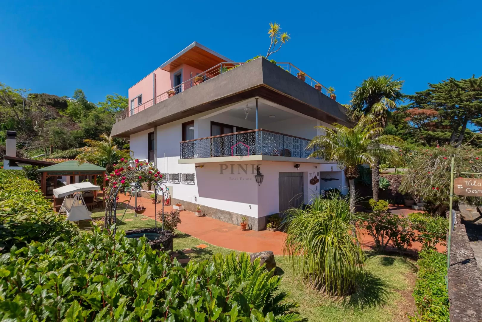 Vila Gama com exploração de apartamentos turísticos ( AL ) . VENDE - SE COM MARGEM DE NEGOCIAÇÃO RELATIVAMENTE AO PREÇO FINAL !!! Trata - se duma bela vivenda , muito bem concebida a nível de arquitetura , transformada em 4 apartamentos T0 e 2 T1 . Áreas ajardinadas , grande variedade botânica ( um autêntico oásis ) , espaço de barbecue , zonas de lazer coletivas , garagem fechada ( 2 viaturas ) , lavandaria de apoio , ampla área de terraço / solário com vistas mar definitivas , como pano de fundo as Ilhas Desertas !! Situada numa área residencial de referência super calma , muito próxima da Cidade de Machico com a sua bela baía , promenade e praia de areia amarela ( todos os serviços e comércio para o quotidiano ... ) . O Campo de Golfe de Santo António da Serra fica a 10 minutos de carro . Várias opções para Turismo de montanha ( levadas e veredas convidado a experiências únicas !! ) . Facilidades de ligação à via rápida bem como ao Aeroporto " Cristiano Ronaldo " . Investimento seguro / garantido para Alojamento Local - ÓPTIMO NEGÓCIO .... Marque visita sem qualquer compromisso . A equipa da " Pink Real Estate " está completamente disponível para dar - lhe todo o apoio que for eventualmente necessário .