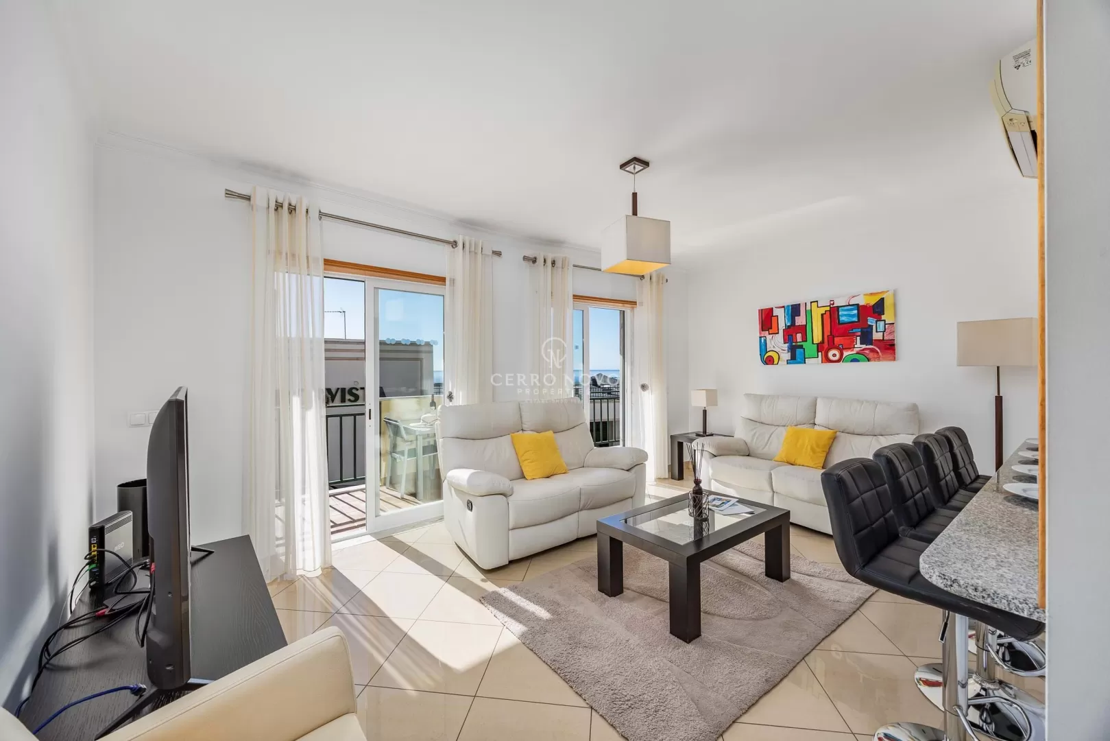 Este confortável apartamento T1+1 com vista mar apresenta-se em excelente estado de conservação. As amplas portas de pátio abrem para o terraço, permitindo a entrada de abundante luz natural na sala de estar e cozinha em open space, ao mesmo tempo que valorizam a bonita vista sobre o oceano. A propriedade dispõe de dois quartos, sendo um deles ensuite, além de uma casa de banho adicional, proporcionando conforto tanto para os residentes como para os seus convidados. No rés-do-chão do edifício existe uma pequena piscina para uso dos residentes e ao nível da cave, o apartamento beneficia de um lugar de estacionamento privativo em garagem , com acesso por comando automático. O edifício dispõe também de elevador. Localizado em Cerro Grande, uma das zonas residenciais mais procuradas de Albufeira, o apartamento beneficia de um ambiente tranquilo e elevado, mantendo-se a curta distância a pé da praia, marina, restaurantes e do centro animado da cidade. Ideal para quem procura uma propriedade lock-up and go, bem conservada e próxima da costa, seja como residência permanente, casa de férias ou oportunidade de investimento. No Cerro Novo, orgulhamo-nos de ajudar os clientes a encontrar imóveis que correspondam perfeitamente ao seu estilo de vida e objetivos. Com mais de 40 anos de experiência no mercado imobiliário do Algarve, a nossa equipa oferece orientação profissional, conhecimento de mercado e apoio personalizado em todas as etapas do processo de compra, garantindo uma experiência segura e tranquila.